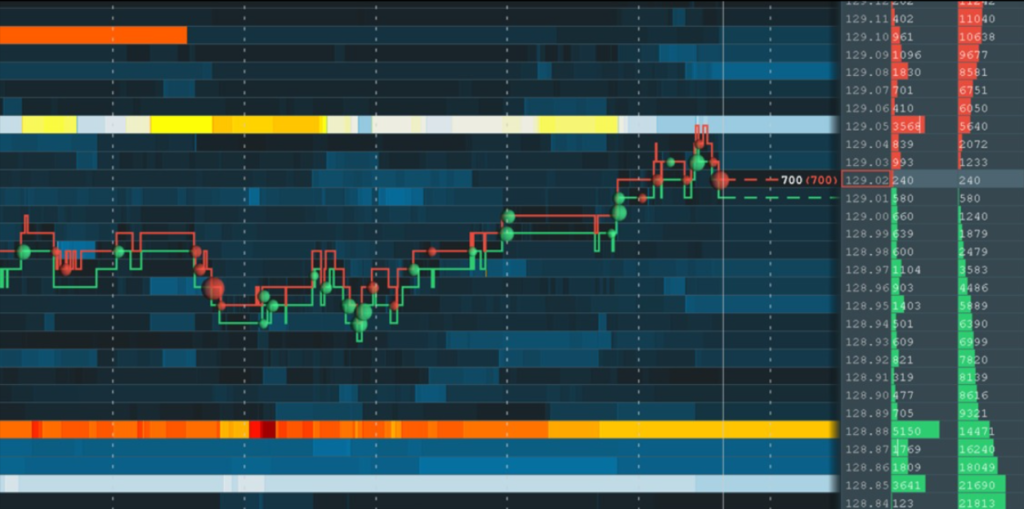 significant buying or selling interest exists. Combined with volume dots that show executed trades and